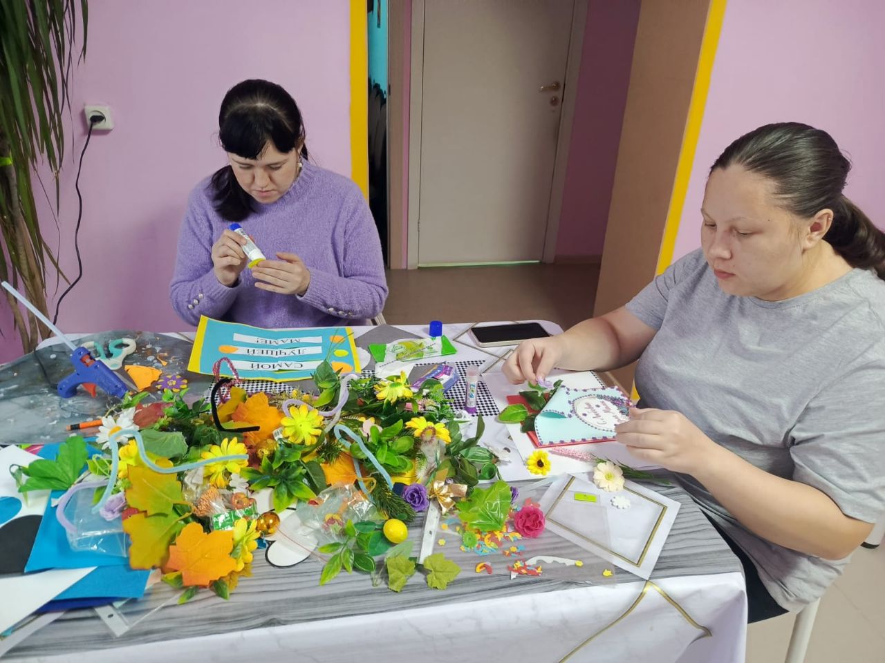 Участники мероприятия, получатели социальных услуг с ментальными нарушениями здоровья, с удовольствием делали своими руками праздничные открытки из цветной бумаги, украшали их яркими бусинами, стразами и тем самым развивали мелкую моторику рук.